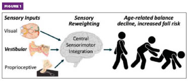 Figure 1. Balance relies on three key sensory inputs. The brain continuously assesses the reliability of these inputs and adjusts their relative utilization through sensory reweighting (SR) to maintain postural stability. Age-related reductions in SR response time or accuracy impair balance and mobility and significantly increase fall risk.