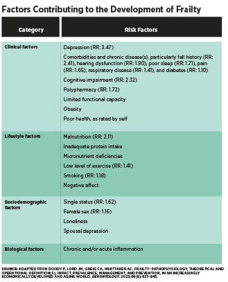 Fall 2025 Issue Beyond Aging How Identifying and Addressing Frailty Can Transform Care Along with sarcopenia, anorexia of aging, and cognitive impairment, frailty is one of the modern Geriatric Giants—a set of syndromes that increase risk for falls, hip fractures, mood disorders, and delirium.1 Specifically, frailty is a syndrome that leaves an individual more vulnerable to stressors in multiple body systems due to a decline in cognitive, psychosocial, and physical capabilities.2 Frailty and the other Geriatric Giants are also associated with substantially increased health care costs and adverse outcomes, including disability, hospitalization, nursing home admission, and death.1,2 Prevalence estimates vary widely because definitions and diagnostic tools are inconsistent. Overall, 12% to 24% of older adults are estimated to be frail.2 More specifically, about 10% of community-dwelling adults aged 65 and older are frail, with prevalence rising to 25% to 50% of those aged 85 and older. In acute care, nearly one-half of hospitalized seniors are frail, and in nursing homes, about half of residents are frail, while another 40% are prefrail.3 Frailty risk is worsened by comorbidities, physical inactivity, poor nutrition, and other factors.4 Women have higher frailty indices than men at every age, with the gap continuously widening after age 75.5 With the global population aging, the number of frail individuals requiring health care is rapidly rising, creating a serious public health challenge.4 Although frailty progresses at an average rate of 3% to 6% annually, it can sometimes be slowed or even reversed with targeted interventions.5 Most importantly, frailty may be prevented when screening and intervention occur during robust or prefrail states.4 Understanding Frailty Defining and Diagnosing Frailty Frailty involves both physical and psychosocial components and can be assessed through several tools. The most common tools used in research are: Fried’s Frailty Phenotype, which assigns an individual a frail phenotype when they meet three or more of these five criteria: unintentional weight loss, weakness or poor handgrip strength, self-reported exhaustion, slow walking speed, and low physical activity. Rockwood’s Frailty Index, which provides a continuous score from one through nine, shows an individual’s accumulation of deficits across more than 60 health-related variables. A person is considered frail with a score of five or higher.3-5 Pathophysiology and Risk Factors The table below provides an overview of the major risk factors that have been associated with the onset and progression of frailty, including their relative risks where available.4,8 These factors span nutrition, physical activity, medical conditions, and social circumstances, emphasizing that frailty is not an inevitable consequence of aging but a condition shaped by multiple influences. Interestingly, BMI was not associated with increased risk of frailty, likely because BMI alone is not an accurate predictor of muscle mass. As well, although most frail individuals were older than nonfrail individuals in the studies reviewed, this was not always the case, showing that factors other than age are more closely correlated with the onset of frailty.8 The Central Role of Nutrition in Frailty That said, frailty is not limited to undernutrition alone. Obesity also elevates risk, particularly when excess weight is accompanied by reduced muscle mass and higher body fat percentage. These patterns highlight the dual role of both insufficient and imbalanced nutrition in driving vulnerability.2 Taken together, the evidence underscores that optimizing nutritional intake is central to maintaining strength, independence, and robustness in aging. Dietary Patterns The inflammatory potential of the overall diet also appears to be critical. Adherence to the Mediterranean diet—emphasizing plant-based foods, olive oil, and reduced intake of meat and dairy—has been shown to reduce frailty risk across Mediterranean and US populations.2 As well, higher scores on the Dietary Inflammatory Index are linked to elevated circulating inflammatory markers and a greater likelihood of frailty, even after accounting for age, comorbidities, physical activity, and energy intake. Finally, limiting ultraprocessed foods is important, as these displace nutrient-dense options while contributing to adverse outcomes such as cardiovascular disease, metabolic syndrome, and cancer.2,6 Protein and Muscle Health Micronutrients and Polyphenols Evidence regarding the impact of vitamin B12 and folate is also mixed, with some studies showing an association between deficiencies and frailty, while others do not. Nonetheless, given their essential roles in metabolism, methylation, and immune regulation, adequate intake is critical for supporting overall health. Calcium and vitamin D are also key for bone and muscle health, and supplementation in older adults has been linked to improved gait speed and muscle strength.6 Because micronutrient interactions are complex and synergistic, and research studying one or two micronutrients has been inconclusive, focusing on a single nutrient may not be effective. In one study, combined supplementation with folate, calcium, and vitamins B6, B12, and D improved frailty outcomes in community-dwelling older adults.6 However, this level of supplementation may not be feasible in most care settings or for older individuals living at home. Ultimately, a nutrient-dense, wholefoods diet remains the most reliable approach to ensuring adequate intake of the micronutrients and polyphenols that can help reduce the risk of frailty development and progression. Nonnutritional Contributors to Frailty Physical Inactivity Across all life stages and levels of frailty, regular exercise protects against multiple frailty risk factors, including its ability to improve muscle strength, mobility, cognition, and mood. Thus, physical activity is as essential as nu