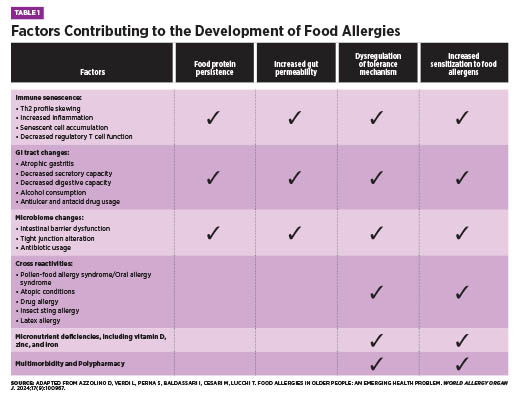 Summer 2025 Issue The Late-Onset Allergy Puzzle Understanding Food Allergies in the Elderly Although food allergies are often considered a childhood concern—frequently believed to resolve with age—recent evidence reveals that food allergies can develop at any point in life and may persist indefinitely. In fact, emerging data suggests that a cow’s milk allergy is as common in older adults as it is in children.1 Diagnosis in older adults can be especially challenging due to age-related changes that alter symptom presentation and/or food allergy development. These changes include immunosenescence, chronic low-grade inflammation, reduced gastrointestinal (GI) function, micronutrient deficiencies, and use of multiple medications.1 In addition, other conditions common amongst elderly individuals have similar symptoms to food allergies, sometimes leading to misdiagnosis.2 As allergies have continued to rise globally, the World Health Organization now classifies them among the top four chronic diseases. Combined with an ageing population, allergic disorders will become increasingly frequent amongst older adults.1,3 This article will explore why geriatric health care practitioners must be equipped to recognize the unique factors that contribute to food allergy development in older adults, understand their clinical presentation and diagnostic challenges, and know how best to implement effective management strategies within the care team to support patient health and quality of life. Epidemiology and Prevalence The discrepancy between diagnosed and self-reported food allergies may result from underreporting or symptom misattribution. In older adults, food allergy symptoms—such as GI distress, abdominal pain, malabsorption, and skin disturbances—often overlap with more common conditions like irritable bowel syndrome, gastroesophageal reflux disease, or idiopathic urticaria. For example, eosinophilic esophagitis (EoE), a food allergy-related condition marked by dysphagia, is especially relevant in older adults, who often have swallowing difficulties for other reasons.1 Similarly, aging skin, prone to dryness and itching, may mask or mimic allergic skin reactions.2 Some adults may have long-standing allergies that worsen over time, while others develop allergies later in life. Emerging food allergy conditions in adults include EoE, food protein-induced enterocolitis syndrome, and alpha-gal syndrome—a red meat allergy linked to IgE antibodies against the alpha-gal sugar.1 Pollen-food allergy syndrome, formerly oral allergy syndrome, occurs more often in adults than children due to respiratory allergen sensitization and affects 13% to 58% of adults, depending on location.5,6 Epidemiologic data reveals key trends. Women are nearly three times more likely than men to develop food allergies, and prevalence is higher in adults over age 60 and those identifying as nonwhite or Hispanic, even after controlling for socioeconomic status. Additional adult-onset risk factors include environmental, medication, insect, or latex allergies; chronic urticaria; and other chronic conditions.4 In order of frequency, the most common adult-onset allergens are shellfish, milk, peanuts, tree nuts, fin fish, egg, wheat, soy, and sesame, whereas childhood-onset allergies more often involve eggs, peanuts, and milk.1 Unlike children, adults are less likely to outgrow their allergies, which tend to persist.1,4 Because symptoms overlap with other conditions and food allergies are often viewed as a childhood condition, clinicians may overlook them in older adults. Immunosenescence and the Aging Immune System Both the innate and adaptive arms of the immune system, as well as their interaction with each other, undergo substantial alterations as people age.3 Hallmarks of immunosenescence include an increased number of memory and senescent lymphocytes, a reduction in naïve lymphocytes, hematopoietic stem cell dysfunction, progressively lower serum levels of total IgE due to reduced output of thymic T-cells, and impaired function of immune regulatory cells.1,3 The balance between T-helper cell subtypes also shifts. With aging, there is a decline in overall T-cell production and a skewing of the T-helper response toward Th2 dominance.2 While Th2 cells are considered anti-inflammatory in some contexts due to their production of cytokines such as IL-4 and IL-10, this type of T-helper cell is also central to allergic responses by recruiting and activating mast cells, eosinophils, and IgE-producing B cells.2,8 As well, peripheral T cells in older adults tend to produce more inflammatory cytokines such as IL-6 and IL-17, which may further promote allergic sensitization and increase the likelihood of developing food allergies.2 Decreased mitochondrial function and ability to respond to stress also contribute to lowered immune system function.3 Additionally, micronutrients which are essential for proper immune function, including iron, zinc, and vitamin D, are often deficient in older adults, which can impair immune regulation and exacerbate allergic responses.3 These immune changes, whether caused by immunosenescence, micronutrient deficiencies, or impaired mitochondrial function, increase susceptibility not only to infections and autoimmune disease but also to chronic inflammation and allergic reactions in older adults.3 Pathophysiology of Late-Onset Food Allergies Nonimmune-mediated reactions include enzyme deficiencies (eg, lactose intolerance), pharmacologic effects (eg, caffeine sensitivity), toxin exposures (eg, scombroid poisoning), and sensitivities to chemical additives like sulfites.1,5 Though these differ from allergies in mechanism, symptom overlap can occur, and both often improve by avoiding triggering foods.5 The aforementioned age-related changes to the immune system are an important part of the pathophysiology of food allergy development in older adults. Chronic inflammation and age drive changes in the GI tract as