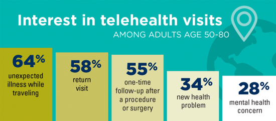 Virtual Medical Visits Get Wary Welcome From Older Adults, Poll FindsFew over 50 have tried telehealth and most see in-person care as better—but one-half would consider it for encounters with their primary providers. The technology is there. The funding is nearly there. The health providers are getting there. But a new national poll suggests that people over 50 aren’t quite ready to fully embrace virtual health visits with their doctors and other providers—also known as telehealth. Only 4% of those polled by the National Poll on Healthy Aging had had a video-based telehealth visit with a provider via smartphone or computer in the past year. Their reactions were mixed. Meanwhile, more than one-half of all those polled didn’t know if their health providers offer telehealth visits at all. More than 80% of older adults polled expressed at least one concern about seeing a doctor or other provider virtually rather than in person. And 47% worried about getting the technology to work. But more than one-half said they’d be willing to try telehealth in some situations, for instance if they got sick while traveling or needed follow-up on previous care. The poll, carried out by the University of Michigan (U-M) Institute for Healthcare Policy and Innovation with support from AARP and Michigan Medicine, U-M’s academic medical center, involved a national sample of more than 2,250 adults aged 50 to 80. They answered questions about many aspects of video-based telehealth. Among the one-third of poll respondents whose health providers don’t yet offer telehealth, 48% said they’d be interested in trying it with their primary care provider. But fewer would try it for specialty or mental health care.