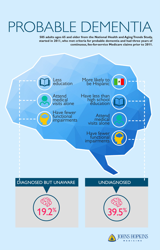 Majority of Older Adults With Probable Dementia Are Likely Unaware They Have It, Study SuggestsLess education and unaccompanied medical visits linked to lack of formal diagnosis or awareness of diagnosis A Johns Hopkins Medicine analysis of information gathered for an ongoing and federally sponsored study of aging and disability adds to evidence that a substantial majority of older adults with probable dementia in the United States have never been professionally diagnosed or are unaware they have been. A report of the findings was published in the July issue of the Journal of General Internal Medicine. Most of the findings, the researchers say, confirm previous similar estimates, but unaccompanied visits to a doctor or clinic emerged as a newly strong risk factor for lack of formal diagnosis or awareness of diagnosis. "There is a huge population out there living with dementia who don't know about it," says Halima Amjad, MD, MPH, an assistant professor of medicine at the Johns Hopkins University School of Medicine and the study's lead author. "The implications are potentially profound for health care planning and delivery, patient-physician communication, and much more," she says. Overall, Amjad says, "If dementia is less severe and people are better able to perform day-to-day tasks independently, symptoms of cognitive loss are more likely masked, especially for patients who visit the doctor without a family member or friend who may be more aware of the patient's symptoms." An estimated 5.7 million people in the United States live with dementia, according to the Alzheimer's Association, but only one-half of those have a documented, official diagnosis by a physician. Timely diagnosis is important for maintaining or improving health and planning care, Amjad says, so it's important to identify which populations are less likely to be diagnosed or less likely to be aware of their diagnosis. Building on previous research, which identified activities and living conditions linked to dementia diagnosis, Amjad sought this time to pinpoint at-risk populations nationwide. To do so, Amjad and the research team drew on data from the National Health and Aging Trends Study, an ongoing study of Medicare recipients ages 65 and older across the United States, and selected those who met criteria for probable dementia in 2011 and had three years of continuous fee-for-service Medicare claims before 2011. The latter information helped the researchers determine whether participants' physicians had billed for dementia diagnosis and/or care. The research team identified 585 such adults and examined demographic data such as highest level of education attained, race/ethnicity, and income, as well as data on whether participants were able to perform activities such as laundry, shopping, or cooking on their own. Among those with probable dementia, 58.7% were determined to be either undiagnosed (39.5%) or unaware of their diagnosis (19.2%). Participants who were Hispanic, had less than a high school education, attended medical visits alone, or were deemed more able to perform daily tasks were more likely to be undiagnosed. Specifically, those with at least a high school education had a 46% lower chance of being undiagnosed compared with those who had less education, and those who attended medical visits alone were twice as likely to be undiagnosed than those who were accompanied. Participants who were diagnosed but unaware of their diagnosis had less education, attended visits alone more often, and had fewer functional impairments. Those with at least a high school education had a 58% lower chance of being unaware compared with those who had less education. Those who attended medical visits alone were about twice as likely to be unaware than those who were accompanied. Each activity impairment decreased the chance of being unaware of diagnosis by 28%. While Amjad acknowledges that the study is limited by potentially inaccurate self-reporting of dementia diagnoses, possible discrepancies between medical record documentation and billing codes, and the use of older data, she says the findings will likely help physicians be more alert to people who may need more careful screening. "There are subsets of people doctors can focus on when implementing cognitive screening, such as minorities, those with lower levels of education, and those who come in by themselves," Amjad says. Looking forward, Amjad plans to study whether documentation of a dementia diagnosis is meaningful if patients and family members don't understand what a diagnosis means.