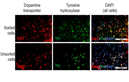 A recent article in Molecular & Cellular Proteomics describes using new cell-surface markers to isolate a homogeneous mixture of dopamine precursor cells. The protocol may improve cell replacement therapy for Parkinson's disease. In this figure from the paper, the authors show that neurons induced from pluripotent cells that have been selected for expression of the newly described dopaminergic cell surface marker contactin 2 (top row) are more likely to express TH, an enzyme involved in dopamine production, and the dopamine transporter DAT, than unsorted cells (bottom row). Reducing the number of nondopaminergic neurons and neural progenitors in a transplant improved recovery in a rat model and is expected to reduce side effects in patients with Parkinson's.