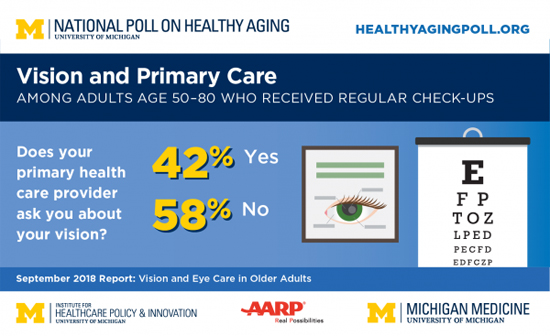 Focus on Aging Eyes: Poll Finds Primary Care Providers Play a Key Role in Vision Care After 50Convenience, cost, and lack of insurance coverage also affect eye care decisions, U-M-AARP National Poll on Healthy Aging shows A new poll suggests that primary care providers could play an important role in promoting vision care for adults age 50 and older, especially for those most in need of eye exams, and those most sensitive to the cost. In all, 18% of respondents to the National Poll on Healthy Aging said they hadn't had their eyes checked by an eye doctor in three years or more, or were not sure when they had their last eye exam by an optometrist or ophthalmologist. While guidelines vary for eye exams for older adults, those with diabetes, a history of eye disease, or certain other conditions should see an eye doctor routinely. Even healthy older adults should have regular exams with an eye care specialist, according to some medical groups. The poll of 2,013 adults between the ages of 50 and 80 was conducted by the University of Michigan (U-M) Institute for Healthcare Policy and Innovation (IHPI), and sponsored by AARP and Michigan Medicine, U-M's academic medical center. In the poll, 58% of older adults who reported that they go for regular medical check-ups said their primary care physician or other providers hadn't asked about their vision. Those with a history of eye disease or diabetes, and those with low incomes, were more likely to have been asked. Seventeen percent of poll respondents said they'd taken an eye-chart vision test right in their primary provider's office. The poll asked those without a recent eye exam what had played a role in their not getting vision care, and allowed them to choose multiple options. One-quarter said cost, and nearly as many said lack of insurance coverage was a reason. More than one-third said they hadn't gotten around to it, and nearly one-quarter said it was easier to buy reading glasses over the counter. The most commonly cited reason, chosen by 40%, was that they weren't having problems seeing. "We know that many eye diseases become more common with age, but that most vision loss is preventable or treatable," says Joshua Ehrlich, MD, MPH, an assistant professor of ophthalmology and visual sciences at the U-M Kellogg Eye Center, part of Michigan Medicine, and a member of IHPI. "For those with risk factors like diabetes and certain other medical conditions or a family history of eye disease, receiving regular eye care could be key to avoiding vision loss." Preeti Malani, MD, director of the poll and a geriatrics specialist, notes that patients and providers may not always think to talk about vision during routine visits. "Older adults often have a long list of health concerns to discuss with their primary care provider," she says. "Difficulties with vision might not always come to mind." Helping Adults Maintain Their Sight About one-quarter of respondents said they'd been diagnosed with one of four major common eye diseases: cataracts, glaucoma, macular degeneration, or diabetes-related eye disease. "Vision loss affects an older adult's overall health, risk of falling, social interactions, and quality of life," says Alison Bryant, PhD, senior vice president of research for AARP. "But, not everyone has coverage for routine vision care and eyeglasses." Partnering With Primary Care Primary care providers are important partners with eye care specialists in advising high-risk adults about when to see an eye doctor, Ehrlich says. For example, adults with diabetes are urged to have a yearly eye exam to protect their sight, and glaucoma screenings are key for older African-Americans and Hispanics because the disease is more common in these groups. An eye exam may reveal signs of ocular disease before noticeable changes in vision. The researchers note that their results may actually underestimate the percentage of adults over 50 who hasn't gotten enough vision screening or care, since it could have been difficult for those with poor vision to complete the survey. The poll results are based on answers from a nationally representative sample of 2,013 people ages 50 to 80. The poll respondents answered a wide range of questions online. Questions were written, and data interpreted and compiled, by the IHPI team. Laptops and internet access were provided to poll respondents who did not already have it. A full report of the findings and methodology is available at www.healthyagingpoll.org, along with past National Poll on Healthy Aging reports.