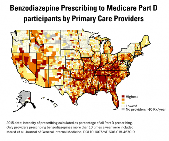 Medicating Distress: Risky Sedative Prescriptions for Older Adults Vary WidelyBenzodiazepine prescribing is most intense in the South, and in economically disadvantaged counties, while individual physicians vary up to six-fold in their prescribing Despite years of warnings that older adults shouldn't take sedative drugs that put them at risk of injury and death, a new study reveals how many primary care doctors are still prescribing them, how often, and exactly where. Mapped out county by county, the study shows wide variation in prescriptions of the drugs, called benzodiazepines. Some counties, especially in the Deep South and rural western states, had three times the level of sedative prescribing as others. The study also highlights gaps at the level of individual prescribers: Some primary care providers prescribed sedatives more than six times more often than their peers. These high-intensity prescribers of drugs such as Xanax, Ativan, and Valium also tended to be high-intensity prescribers of opioid painkillers. The counties with the most intense sedative prescribing also tended to have lower incomes, less-educated populations, and higher suicide rates, the study finds. They also overlap with other maps showing high county-level opioid painkiller prescribing. "Taken all together, our findings suggest that primary care providers may be prescribing benzodiazepines to medicate distress," says Donovan Maust, MD, MSc, the geriatric psychiatrist from the University of Michigan (U-M) who led the study. "And since these drugs increase major health risks, especially when taken with opioid painkillers, it's quite possible that benzodiazepine prescribing may contribute to the shortened life expectancies that others have observed in residents of these areas." Published in the Journal of General Internal Medicine by a team from U-M department of psychiatry and the University of Pennsylvania, the study shows the power of data to highlight persistent inappropriate use of medications. Prescribing Totals In the single year studied, the 122,054 primary care providers included in the study prescribed 728 million days' worth of benzodiazepines to their patients, at a cost of $200 million. The states with the highest intensity of prescribing—which the researchers defined as the proportion of all medication days prescribed that were of benzodiazepines—were Alabama, Tennessee, West Virginia, Florida, and Louisiana, while Minnesota, Alaska, New York, Hawaii, and South Dakota had the lowest. Across all types of providers, primary care and otherwise, benzodiazepines accounted for 2.3% of all medication days prescribed to Part D participants by those providers that year. Primary care doctors accounted for 62% of the total. In fact, the researchers focused on primary care providers specifically because previous studies had showed they account for the majority of benzodiazepines prescribed to older adults, who are much less likely than younger adults to see a psychiatrist. Higher sedative prescription intensity was also associated at the county level with more days of poor mental health, a higher proportion of disability-eligible Medicare beneficiaries, and a higher suicide rate. More About Sedative Risks But the drugs come with a price: clouded thinking ability, higher risk of auto accidents, falls and fractures, and a tendency to hook patients into long-term use despite their intended use as a short-term treatment. Benzodiazepines as a class are the second-most common group of drugs associated with medication-related overdose deaths, right behind opioid painkillers. Such risks have landed benzodiazepines on the national guideline for prescription drugs that people over age 65 shouldn't take, though their short-term use in treating anxiety or insomnia that haven't responded to other options is still considered acceptable. More About the Study The researchers divided individual prescribers into four groups according to the intensity level of their benzodiazepine prescribing. The range was large—for the lowest group, about 0.6% of their total prescriptions were for benzodiazepines, compared with 3.9% of the highest-intensity group. That's a 6.5-fold difference in benzodiazepine prescribing. Those in the highest-intensity group were also likely to be high-intensity prescribers for opioids and antibiotics, and also for other drugs that have been classed as high-risk for older adults. "That the same providers appear to be high-intensity prescribers of both medications is potential cause for concern," Maust says. Female primary care providers were less likely to be high-intensity benzodiazepine prescribers. The more years a physician had been in practice, the higher their chance of being a high-intensity prescriber. Physicians with higher percentages of patients who were white, or who received the "Extra Help" payments available to low-income, low-resource patients under Part D of Medicare were also more likely to be high-intensity sedative prescribers. The researchers could not see data down to the patient-level in the available Medicare data, so they couldn't look at what conditions patients were listed as having, other clinical findings, or the patients' individual social and economic status. In addition to Maust, the research team included senior author Steven Marcus, PhD of the University of Pennsylvania, and U-M department of psychiatry faculty L. Allison Lin, MD, MSc, and Fred Blow, PhD. Maust, Lin, and Blow are all members of the U-M Institute for Healthcare Policy and Innovation.